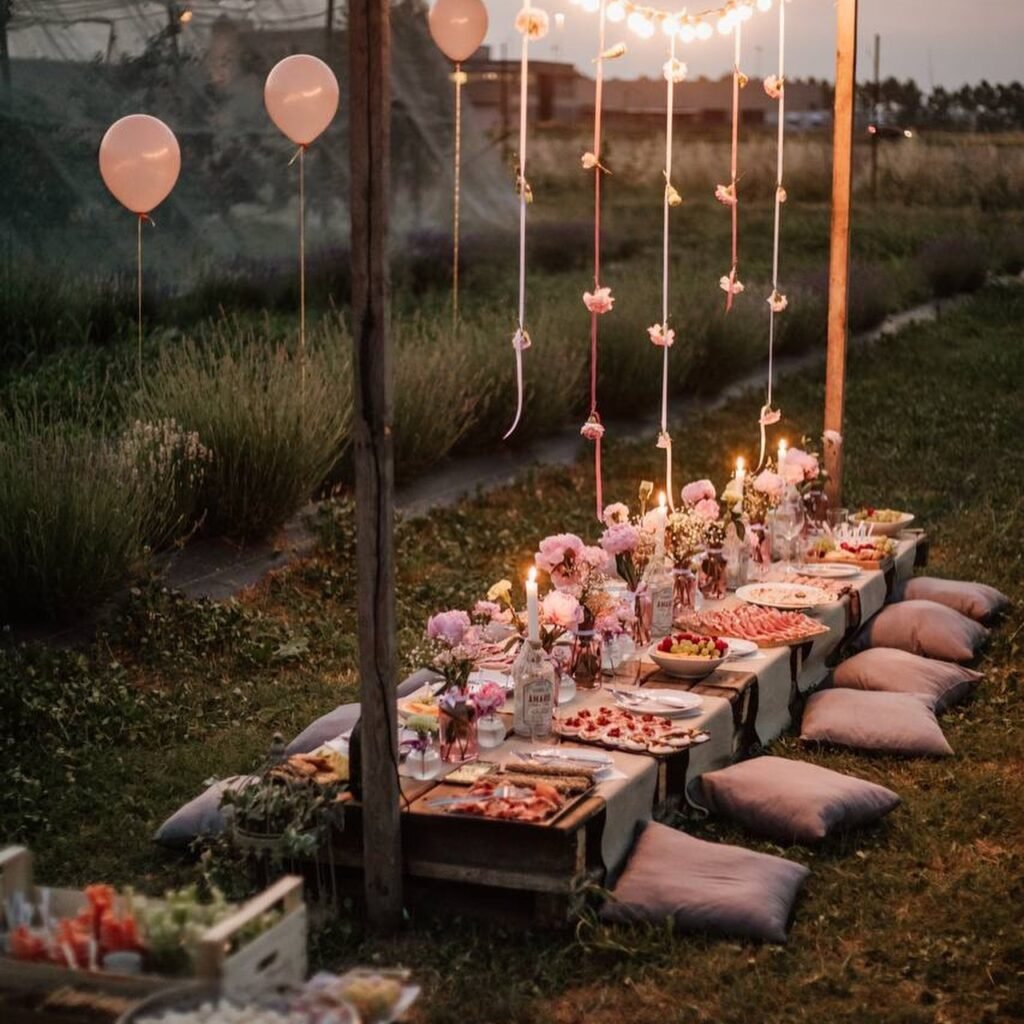 This enchanting outdoor dinner party uses soft lighting, delicate flowers, and hanging decorations to create pure romance. Pink balloons float gently while string lights twinkle overhead, making everything feel dreamy.