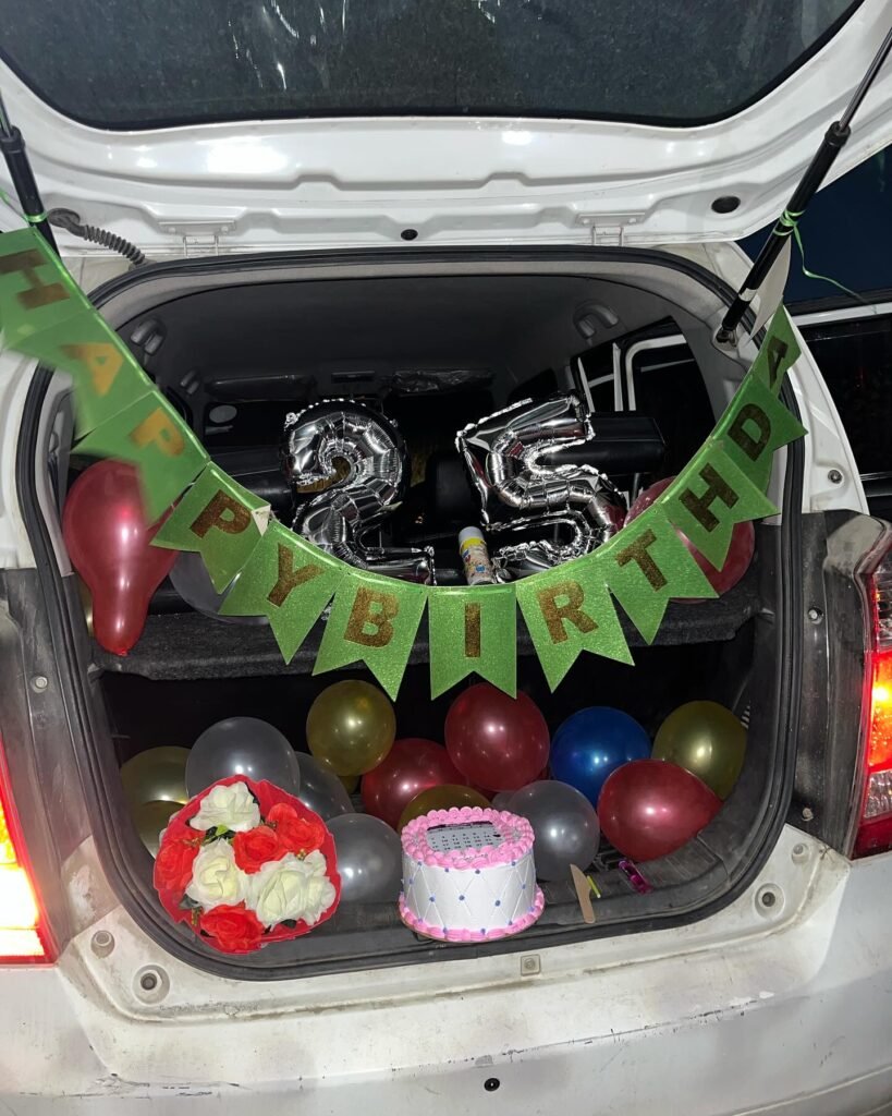 This creative car trunk setup proves you don’t need a huge space for meaningful celebrations. Colorful balloons, a “Happy Birthday” banner, and sweet treats transform an ordinary vehicle into a party venue.