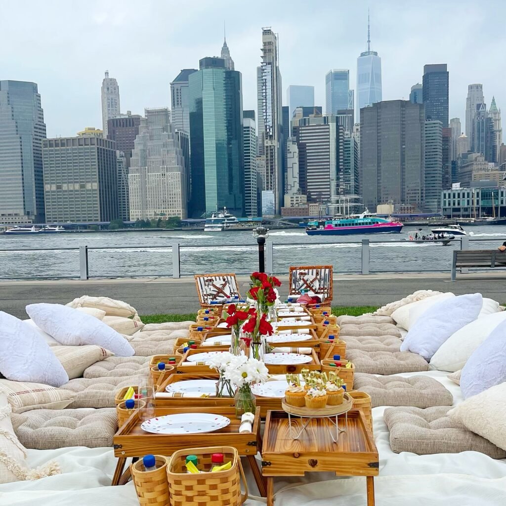 This waterfront setup proves that outdoor dining can be absolutely stunning. Those vintage picnic baskets paired with plush cushions create such an inviting atmosphere, while the Manhattan skyline provides the most incredible backdrop imaginable.