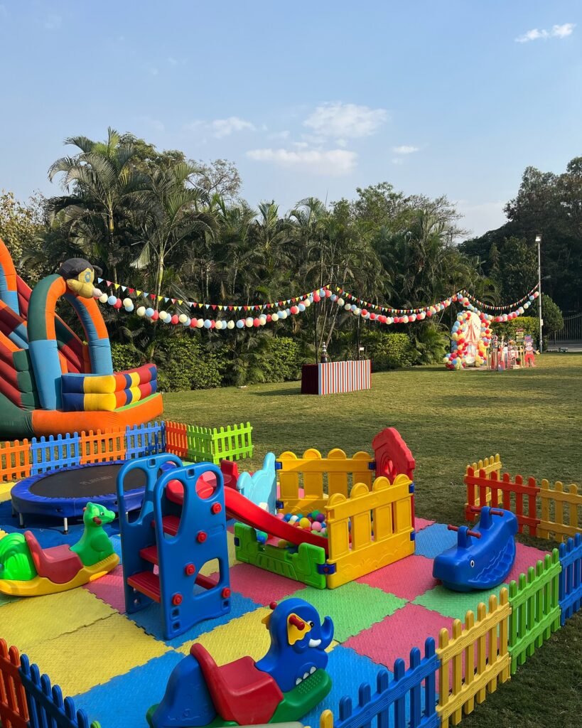 The setup features bright inflatable slides, colorful play equipment, and cheerful decorations that instantly grab children’s attention. Rainbow bunting stretches across the green lawn while a dedicated toddler play area keeps the little ones safely entertained.