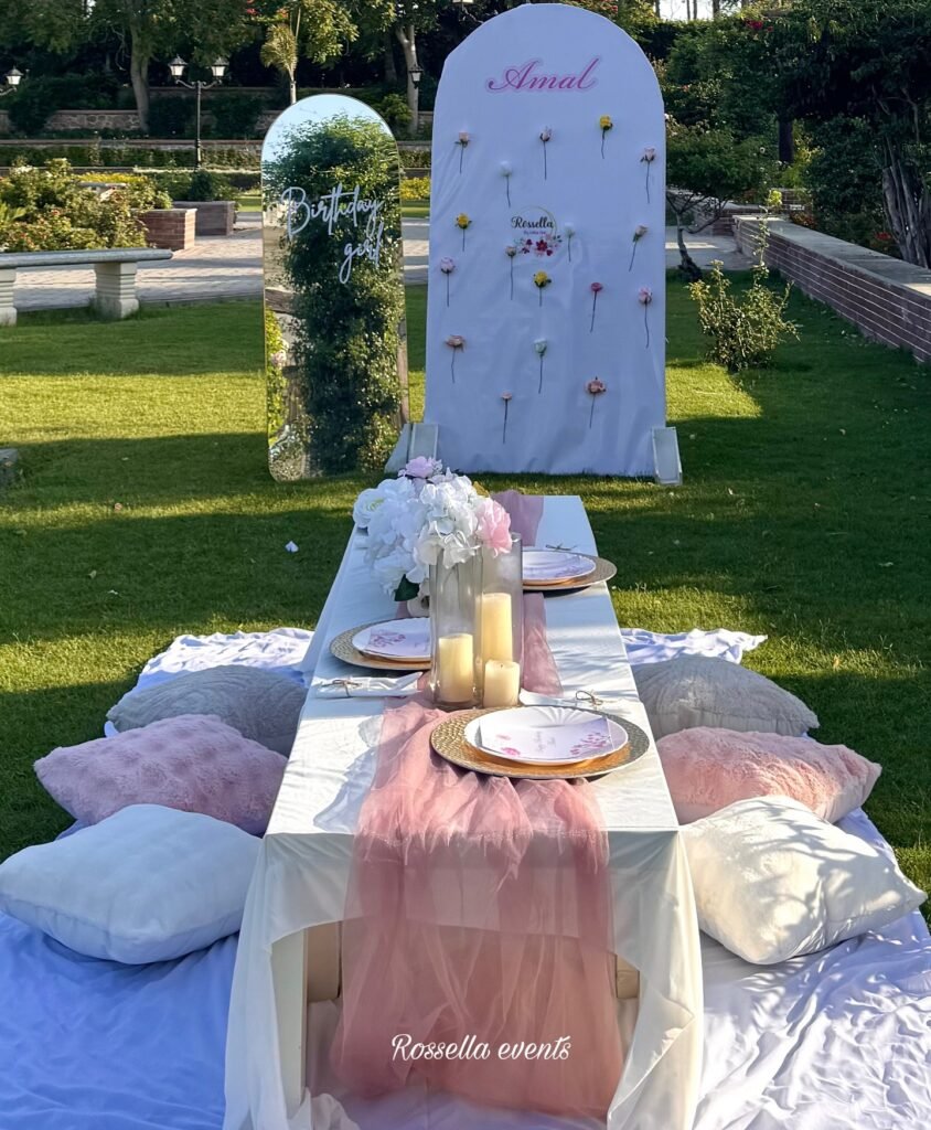 The low seating arrangement with plush cushions encourages intimate conversation among guests. It’s perfect for milestone birthdays or when you want something more sophisticated than typical party setups. The natural garden setting completes this fairy-tale atmosphere.