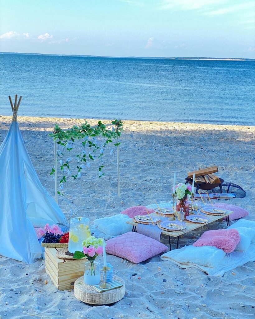 This coastal setup embraces that laid-back beach vibe with fluffy floor cushions in dreamy pastels and a sweet little teepee for shade. The natural greenery backdrop adds such a lovely organic touch to the scene.