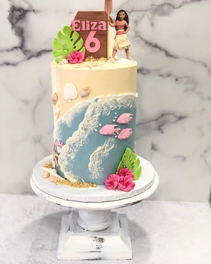 This enchanting pool party birthday cake idea draws inspiration from a beloved oceanic tale, featuring a vibrant blue base that flawlessly represents the deep, mysterious sea. White swirling accents on the sides evoke crashing waves, adding dynamic movement.