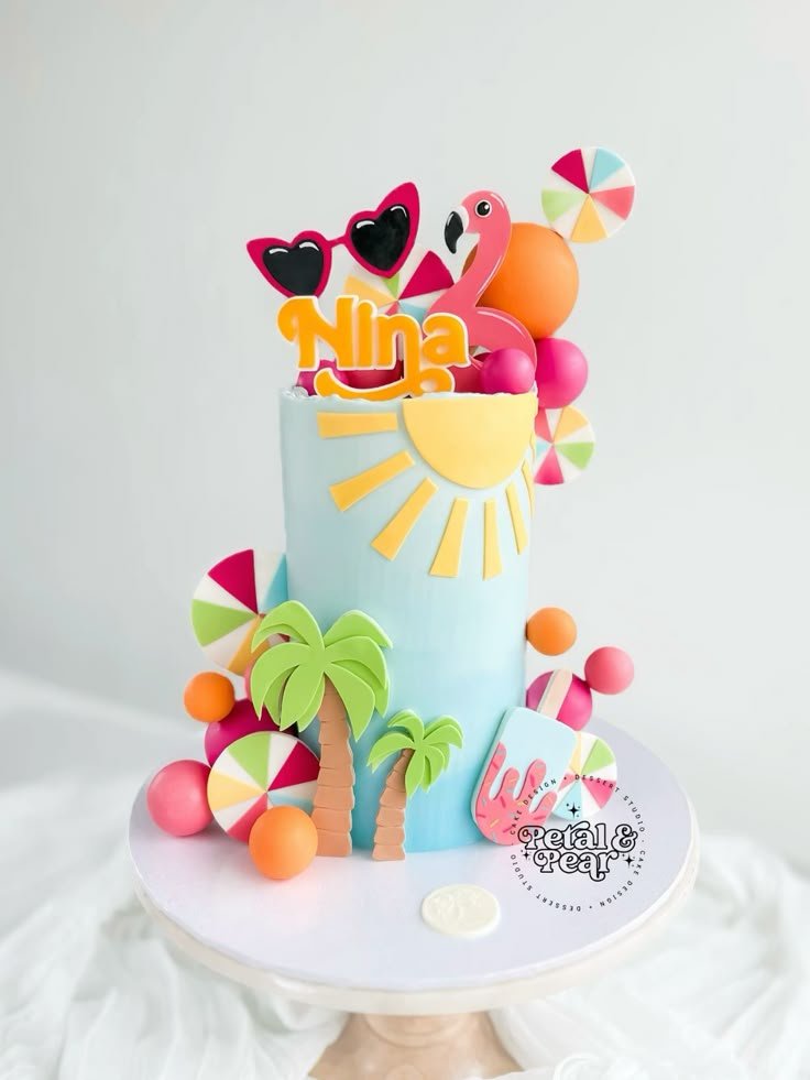 Adorned with whimsical elements, this cake features a charming flamingo topper alongside cool sunglasses and “Nina” in playful lettering. Miniature palm trees and colorful beach balls add to the tropical flair. Small candy umbrellas in various hues provide delightful pops of color.