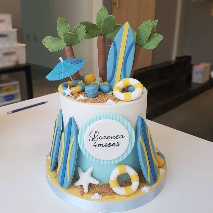 The cake is adorned with delightful beach-themed toppers. You’ll find charming palm trees providing shade, a colorful surfboard ready for waves, and a cheerful beach umbrella. Small seashell and starfish accents are scattered across the sandy top, adding to the seaside charm.