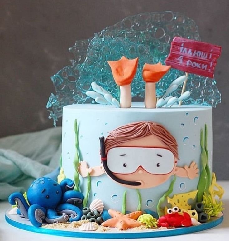 A charming little boy, complete with goggles, appears to be splashing in the water, adding a dynamic and joyful touch to the design. This cake is a fantastic choice for a young adventurer’s birthday, making it a thrilling and engaging pool party birthday cake idea.