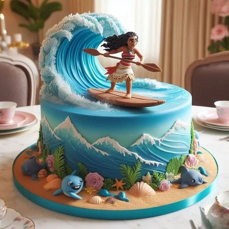 A character figurine stands proudly on the cake, embodying the spirit of exploration and connection to the ocean. This beautifully detailed cake is a captivating and imaginative pool party birthday cake idea, perfect for any young explorer’s celebration.