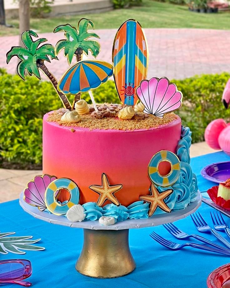 This vibrant cake transports you straight to a sandy shore, making it a fantastic pool party birthday cake idea. The base features a beautiful orange and pink ombre effect, resembling a warm sunset over the ocean. A layer of crushed cookies on top creates the look of golden sand, ready for beachcombing.
