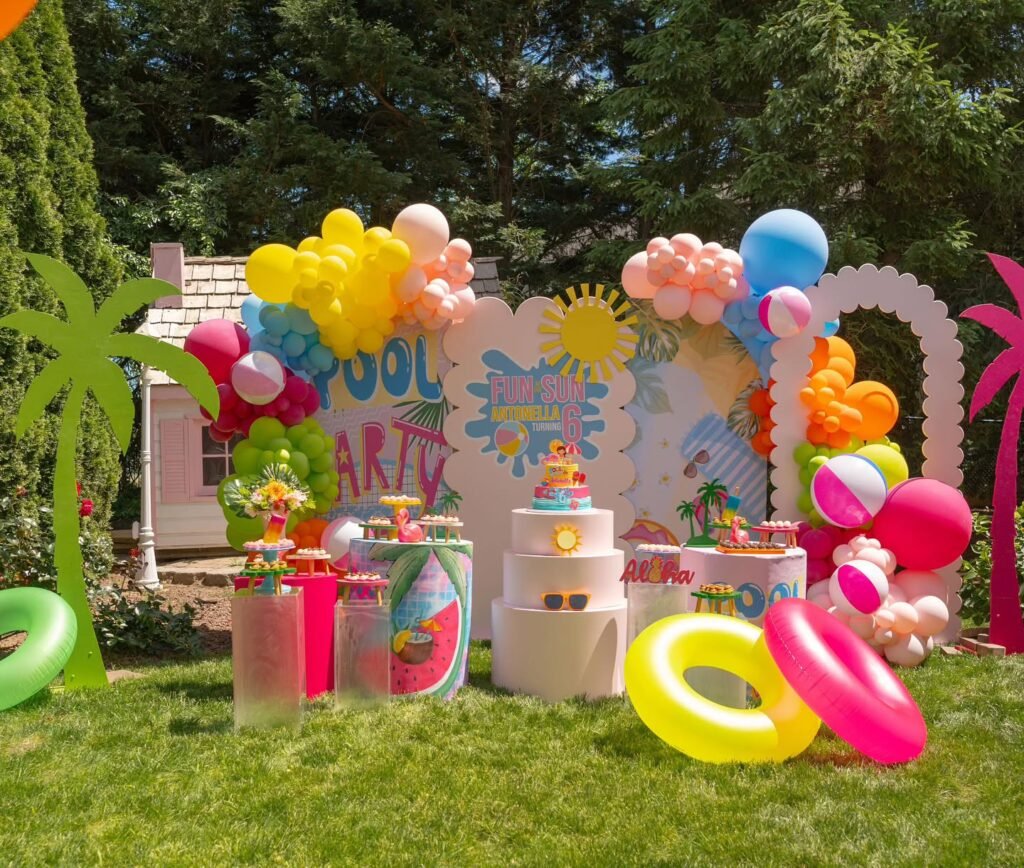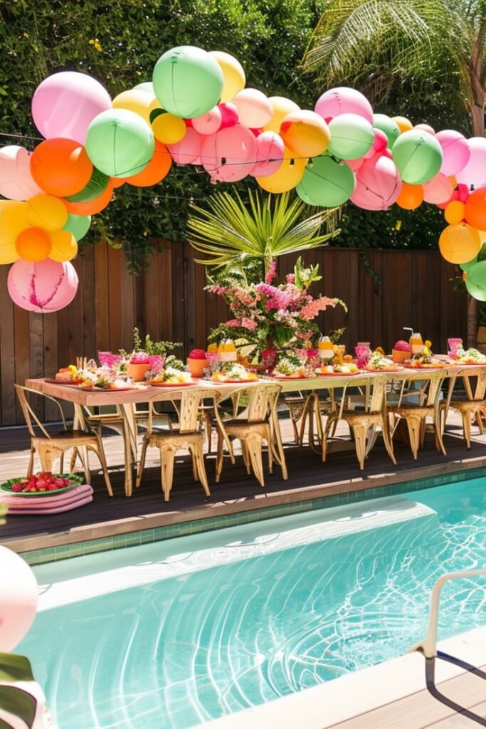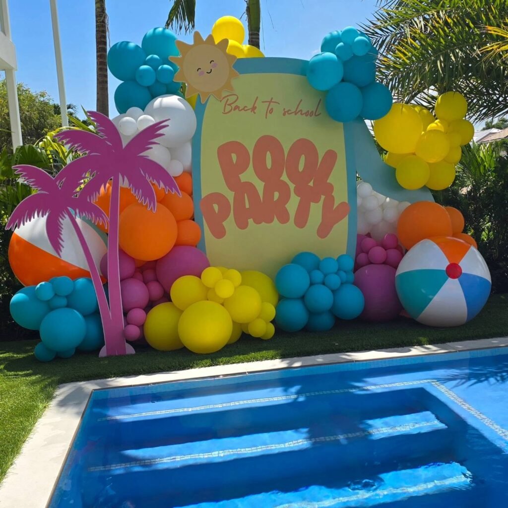 This vibrant pool party setup is a beacon of summer fun. A colorful “Pool Party” banner and bright balloons create a cheerful and welcoming atmosphere for all guests.