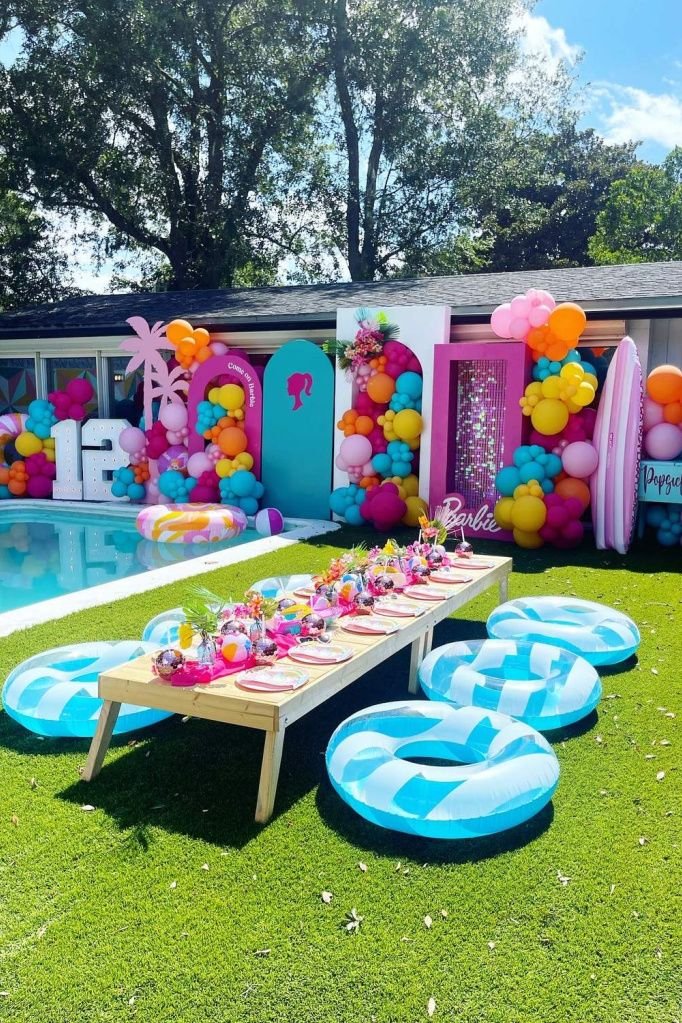 The bright pinks, oranges, and blues of the decor make for an unforgettable, themed pool party. It is a fantastic way to bring the world of Barbie to life.