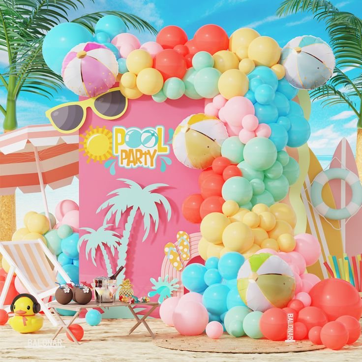 This festive pool party setup is a vibrant, tropical escape. A colorful balloon arch frames the scene, while an inflatable surfboard and palm trees create a playful, sun-soaked atmosphere.