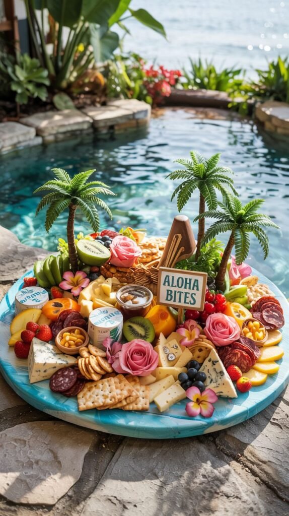 This vibrant charcuterie board is a festive centerpiece for a pool party. The “Aloha Bites” sign and mini palm trees give it a playful, tropical theme.
