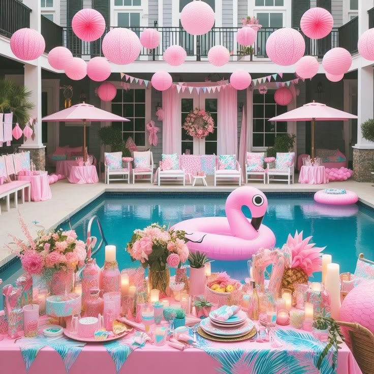 This beautiful pool party is a vision in pink. Pink lanterns and bunting create a festive canopy, while flamingo floats add a whimsical and tropical touch to the scene.