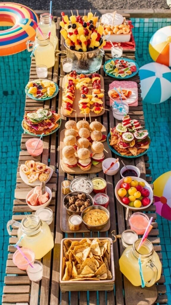 This setup not only looks beautiful but also offers healthy and delicious options. It’s an easy way to elevate your pool party with a touch of elegance.