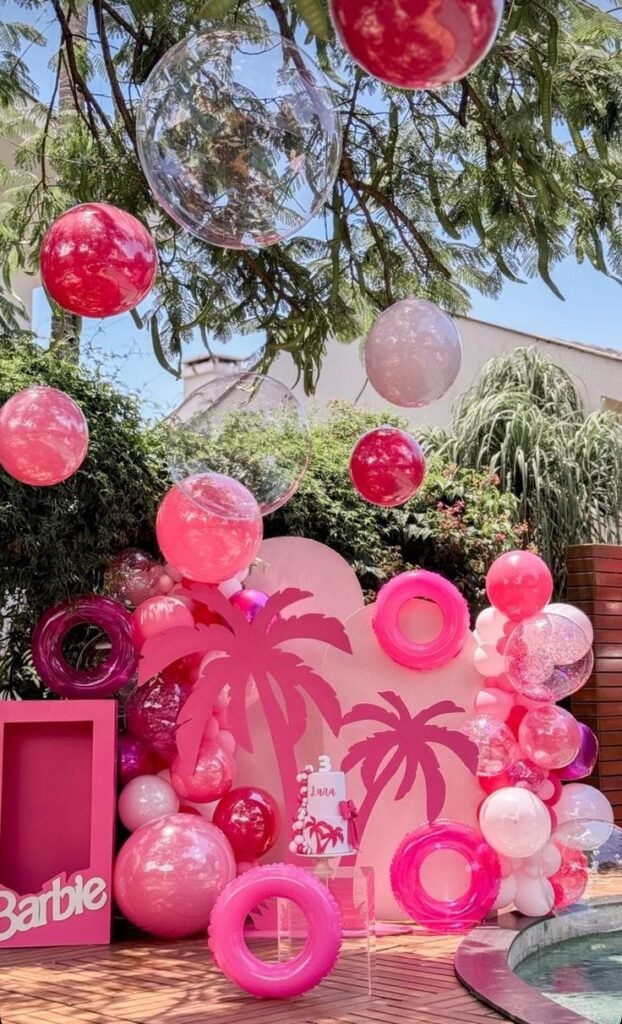 This pink pool party setup is a Barbie fan’s dream. A custom backdrop features stylized palm trees, setting a tropical scene filled with various shades of pink.