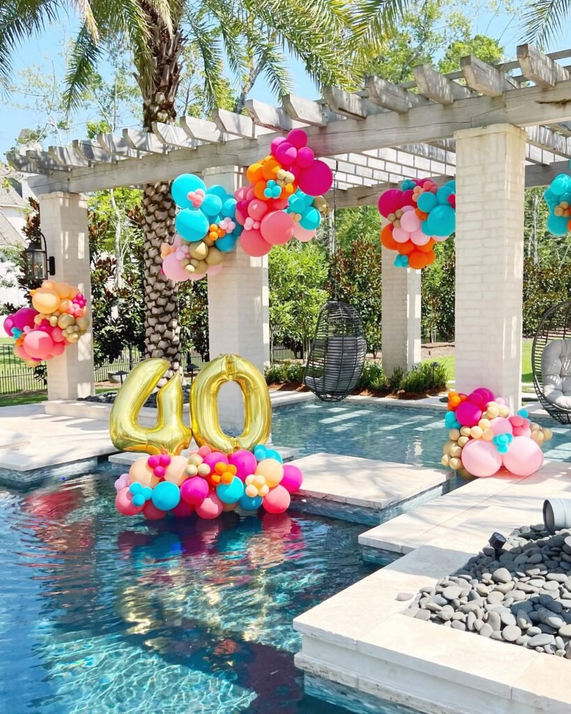 Celebrate a milestone birthday with an elegant pool party setup. Golden “40” balloons float gracefully, anchored by vibrant balloon clusters in cheerful hues.
