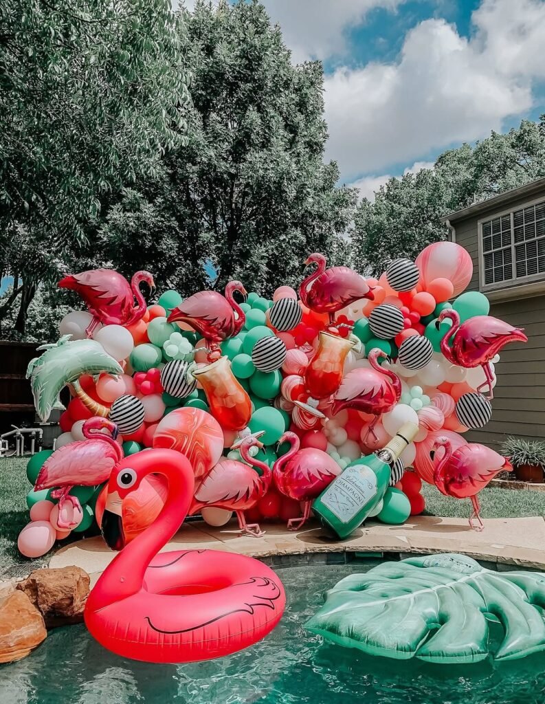 Create a tropical getaway right in your backyard with this vibrant flamingo-themed pool party. The lively balloon arch features playful flamingo shapes, bold stripes, and lush palm fronds.
