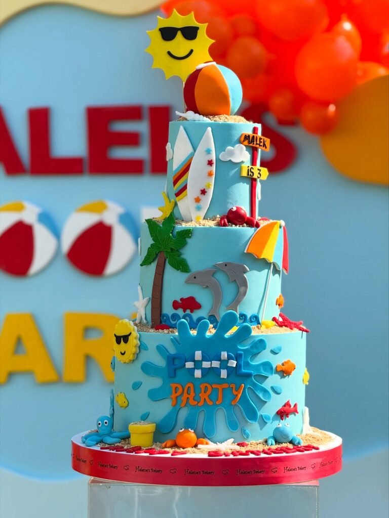 This delightful tiered cake brings the ocean to your pool party. Adorned with playful surfboards, friendly dolphins, and tropical palm trees, it captures summer fun.