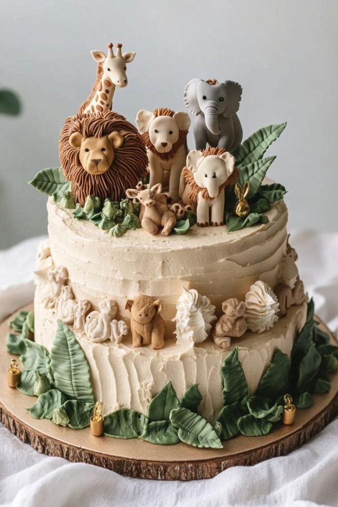Around the cake, sweet characters like a gentle elephant, a tall giraffe, and a playful monkey add to the whimsical safari scene. A cute zebra also makes an appearance, completing the wild ensemble. Each animal is crafted with lovely detail, bringing smiles to everyone who sees them.