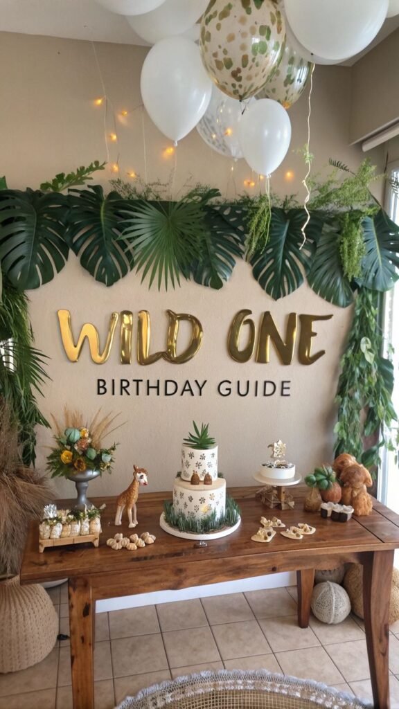 This beautifully curated display provides ample inspiration for a memorable safari birthday party, especially for a first birthday. Large, gold “WILD ONE” balloon letters stand prominently against a neutral wall, forming a striking backdrop. Lush green foliage, including large monstera leaves and cascading vines, frames the lettering, creating an inviting jungle ambiance.