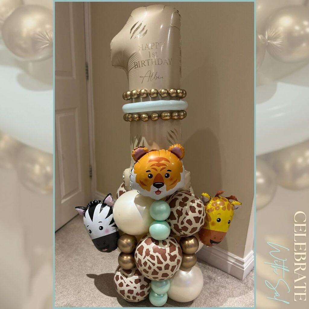This impressive balloon tower makes a striking statement for Albie’s first safari birthday party. A large, shimmering number “1” balloon crowns the top, wishing “Happy 1st Birthday Albie” in elegant script. Below, a clever arrangement of balloons creates a sturdy and visually appealing base.