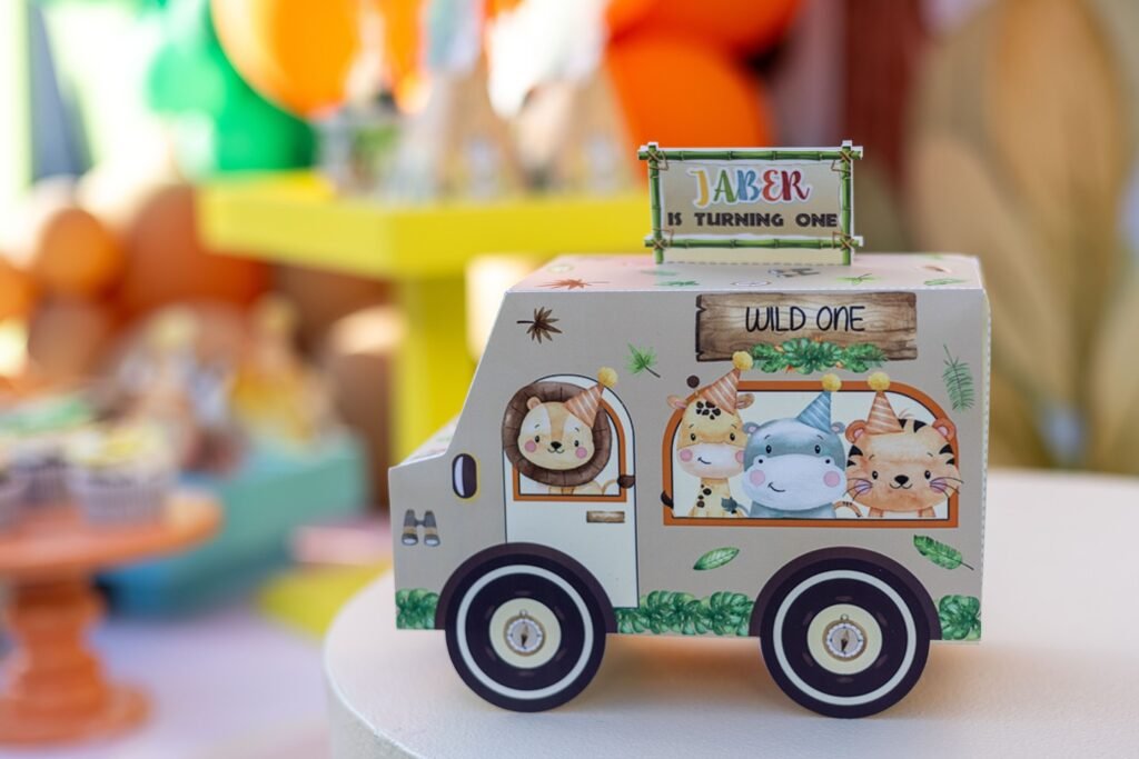 A cute sign atop the box announces “Jaber is Turning One” in a playful, jungle-inspired font, personalizing this delightful favor. The muted color palette of the vehicle, combined with vibrant touches of green foliage, makes it visually appealing. This box is not only decorative but also practical, ready to hold small treats or party favors.