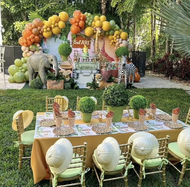 Small potted plants serving as centerpieces enhance the natural, wild ambiance. This comprehensive outdoor arrangement ensures both a visually stunning focal point and a comfortable dining area for guests, making it a truly memorable safari birthday party celebration. Every detail contributes to an exciting and fun atmosphere.