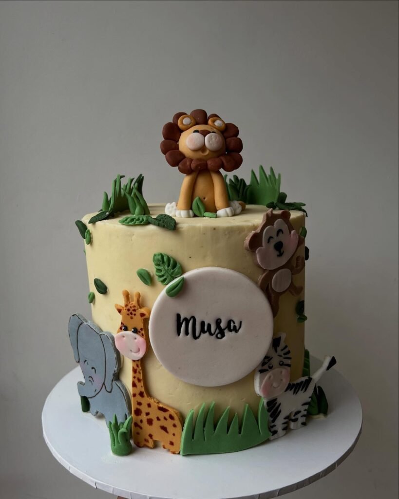 A prominent white circle with “Musa” written in elegant script personalizes this delightful creation. This cake not only tastes amazing but also serves as a fantastic focal point, perfectly capturing the fun and adventurous spirit of a safari birthday party. It’s an unforgettable treat for the birthday star.