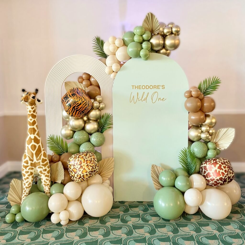 This beautifully styled backdrop is absolutely perfect for a safari birthday party, especially a first birthday celebration. Two elegant arched panels, one featuring a ribbed design and the other a smooth, light green, create a sophisticated foundation. “Theodore’s Wild One” is written charmingly on the green arch, personalizing the event.