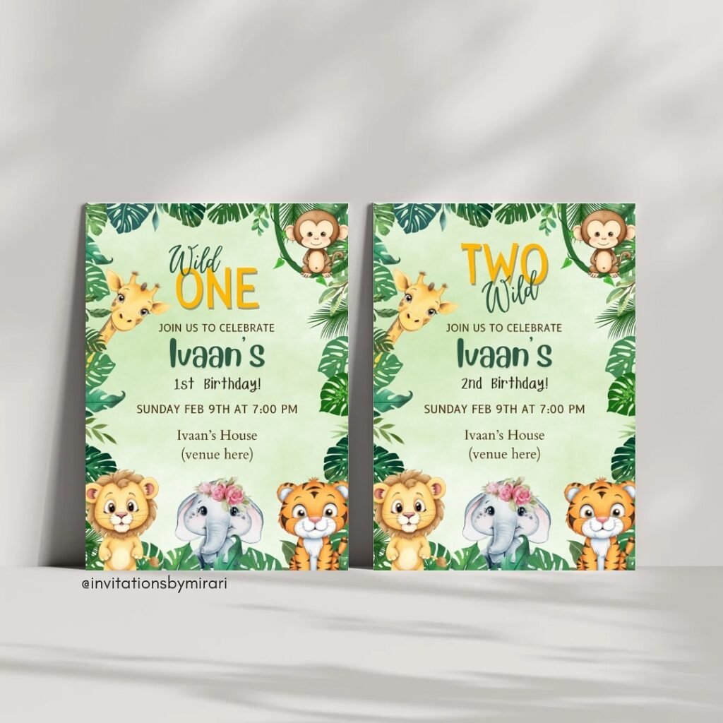 These charming invitations set the perfect tone for a safari birthday party, whether for a first or second year celebration. Lush green leaves frame the design, immediately immersing guests in a jungle adventure. Playful illustrations of a giraffe, monkey, lion cub, elephant, and tiger cub peek out from the foliage, promising a day filled with fun.