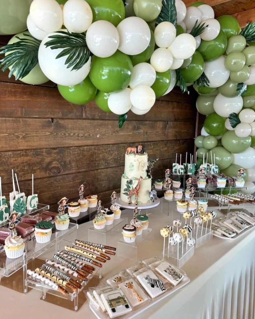This impressive dessert table provides an incredible spread for a safari birthday party, promising delights for every guest. A beautiful tiered cake, adorned with safari animals, anchors the display, drawing all eyes to its charming design. Overhead, a lush balloon garland in various shades of green and white, interspersed with tropical leaves, creates a festive jungle canopy.