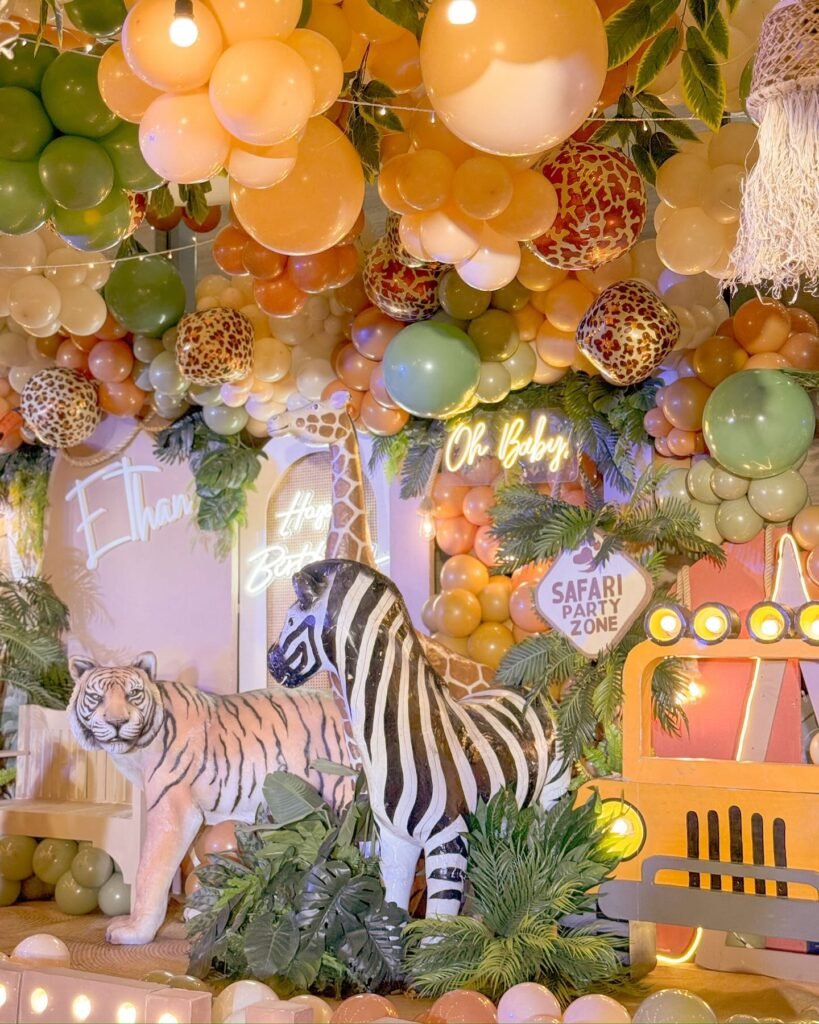 Neon signs glow softly, with one proclaiming “Oh Baby” and another possibly “Ethan Happy Birthday,” adding a modern touch to the wild theme. A wooden safari vehicle prop, labeled “SAFARI PARTY ZONE,” hints at adventure and playful exploration for all guests. The layered decor creates a truly immersive experience.