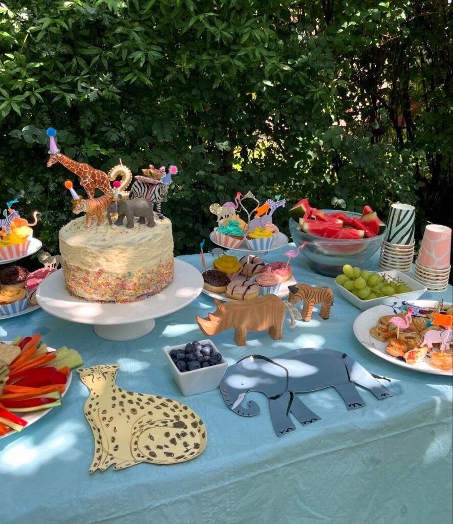 Animal-shaped plates, cups with zebra stripes, and cheerful napkins enhance the safari birthday party atmosphere. Guests can enjoy a mix of savory snacks like vegetable sticks, ensuring there’s something for everyone. This setup truly creates a fun and inviting environment for an outdoor birthday adventure.