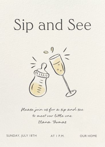 This playful sip and see invitation is a cute and creative choice. The simple line drawings of a baby bottle and a champagne glass toasting each other perfectly represent the event. It sets a fun, casual mood for the celebration.