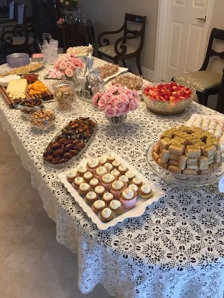 This abundant dessert table is a delightful way to treat guests at a sip and see party. The beautiful lace tablecloth and varied platters create a warm, inviting feel. A mix of sweet and savory items ensures there’s something for everyone to enjoy.