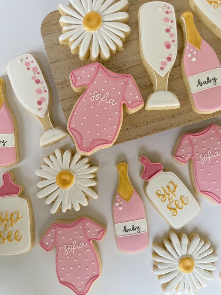 These charming iced cookies make a lovely addition to any sip and see party. Shaped like baby onesies, champagne bottles, and glasses, they perfectly fit the celebration’s theme. The pink, white, and gold colors are a beautiful and sophisticated choice.