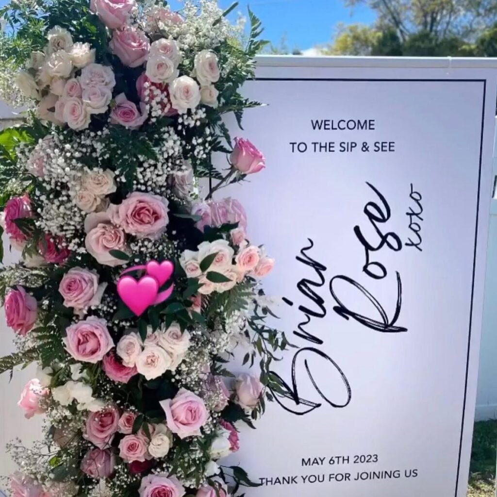 This beautiful welcome sign creates a grand and elegant entrance for a sip and see party. A stunning column of blush pink and white roses along with baby’s breath adds a luxurious floral element. This arrangement instantly sets a soft and celebratory mood for the occasion.