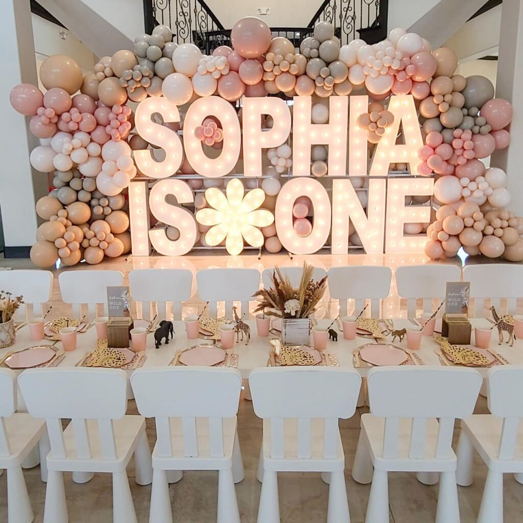 The balloon garland is a work of art, with balloons in soft shades of blush, beige, and taupe. It perfectly frames the marquee letters. This color palette gives a modern twist to the classic safari theme, making it feel elegant and fresh.
