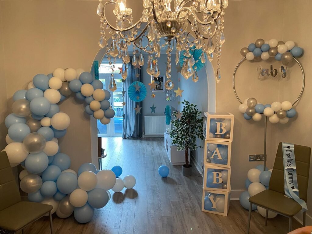 The transparent blocks spelling out “Baby” are a great focal point. The clear boxes filled with balloons make for a chic and modern display. A small plant next to the blocks adds a nice touch of nature and a pop of green to the scene.