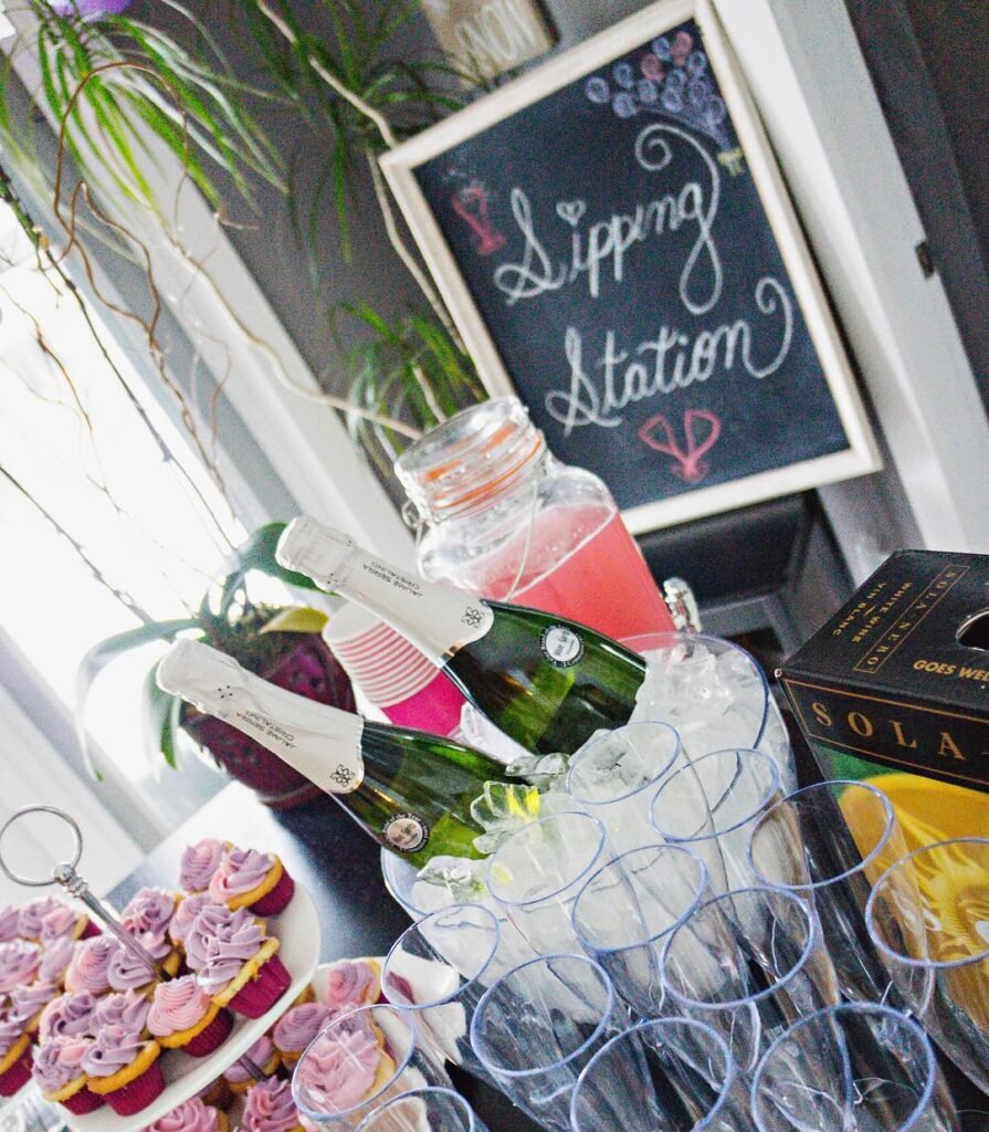 This “Sipping Station” is a fun and functional idea for a sip and see party. A framed chalkboard sign with whimsical script clearly labels the area. It guides guests to where they can grab a drink and makes the process easy.