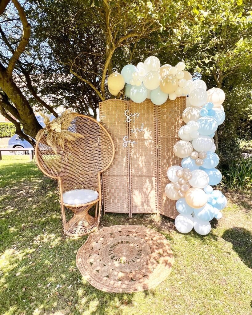 The backdrop features a light brown screen with a “Sip and See” sign, creating a private area for pictures. A stunning balloon garland in shades of light blue, tan, and white adds a soft, celebratory pop of color. The round woven rug pulls the natural, earthy look together.