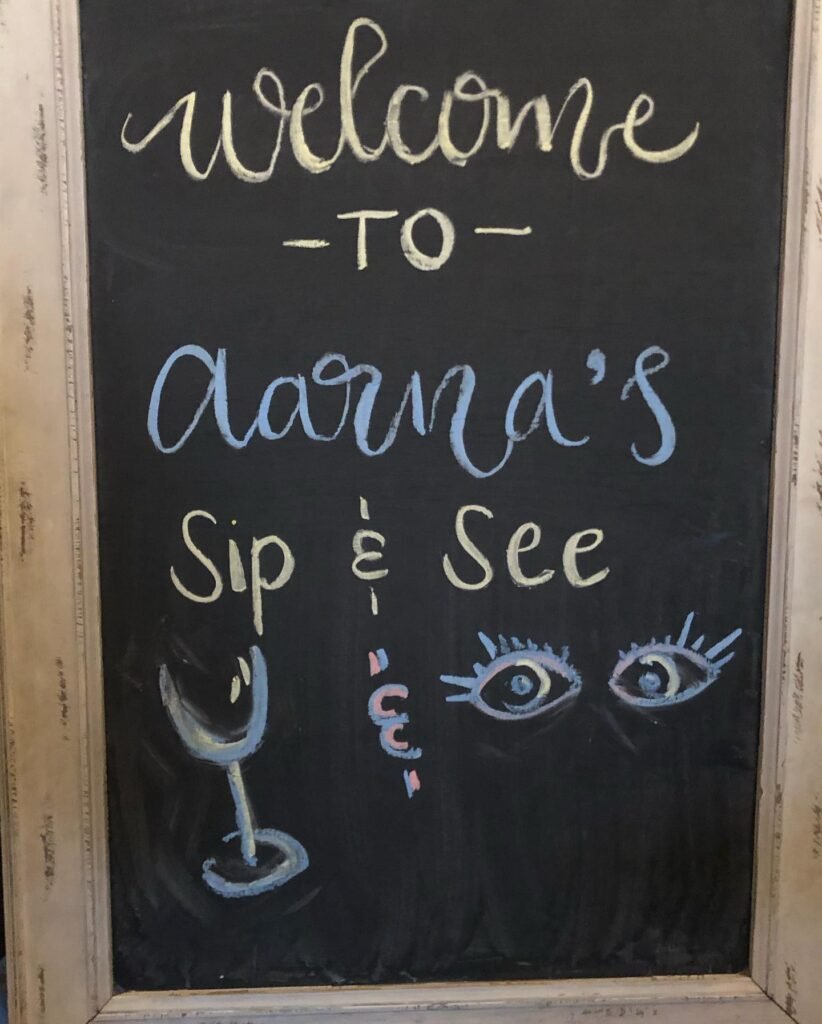 Clever doodles of a sipping glass and seeing eyes playfully illustrate the party’s theme. This artistic addition is a whimsical and memorable way to greet guests. It perfectly captures the essence of the “sip and see” event.