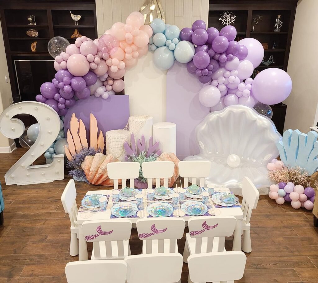 This enchanting “Mermaid Under the Sea” theme is a magical idea for a sip and see party. A beautiful balloon arch in soft shades of pink, lavender, and blue frames the entire scene. It is a creative way to set the mood for an underwater adventure.