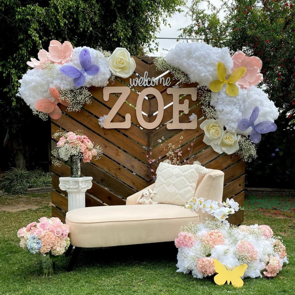 This whimsical sip and see party backdrop is truly a work of art. The wooden wall and faux clouds create a beautiful base, while pastel-colored paper flowers and butterflies give a magical garden feel. The baby’s name, “Zoe,” is displayed in large wooden letters.
