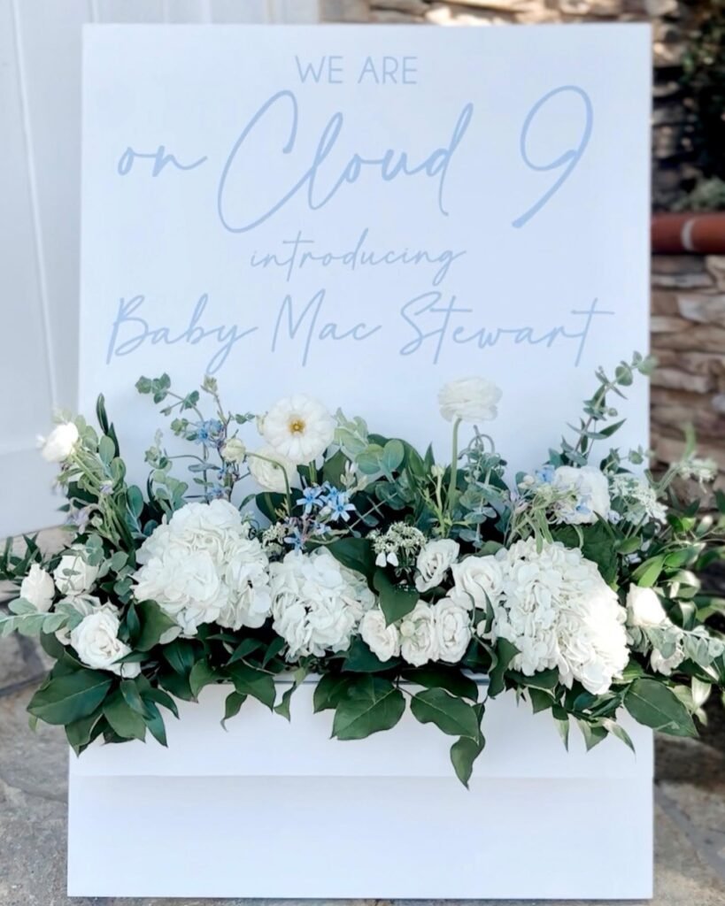 This beautiful welcome sign offers a special greeting for guests at a sip and see party. The phrase “We are on Cloud 9” in a lovely script sets a joyful and celebratory tone. It is a heartfelt way to share the family’s happiness.