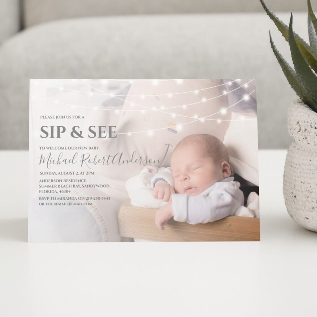 This elegant sip and see party invitation features a beautiful photo of the new baby. Including the little one’s picture on the card gives guests a first look and builds excitement. The soft, faded image and string lights create a warm, gentle feeling.