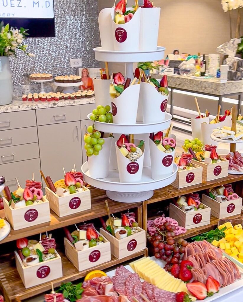 Below the tower, a large charcuterie spread is artfully arranged with various cured meats, cheeses, and grapes. The individual wooden boxes with their own unique selections are a clever touch. Guests can easily grab their own portion to enjoy.