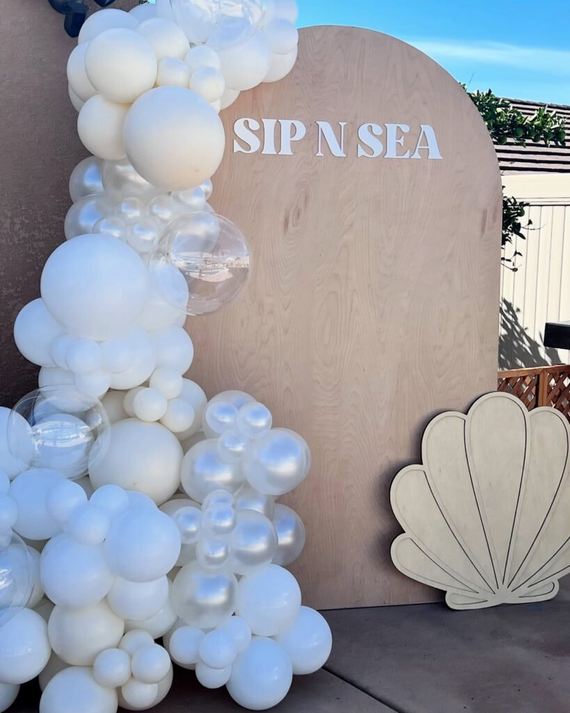 This delightful “Sip N Sea” backdrop creates a charming theme for your sip and see party. A wooden arch with elegant lettering evokes a serene, seaside feel. It is a fantastic photo opportunity.