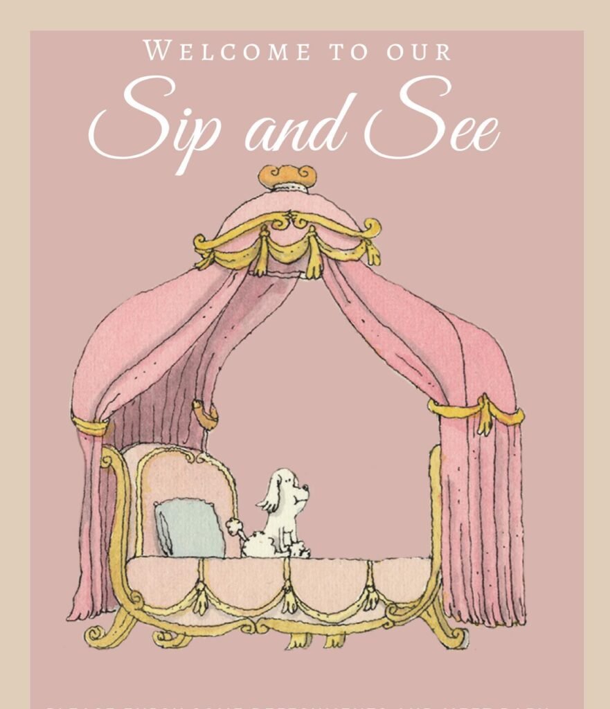 This regal sip and see party welcome sign features a charming, hand-drawn illustration. The image of a small dog sitting on a lavish, canopied bed with the words “Welcome to our Sip and See” creates a playful and elegant feel. It’s a very cute and creative way to greet guests.