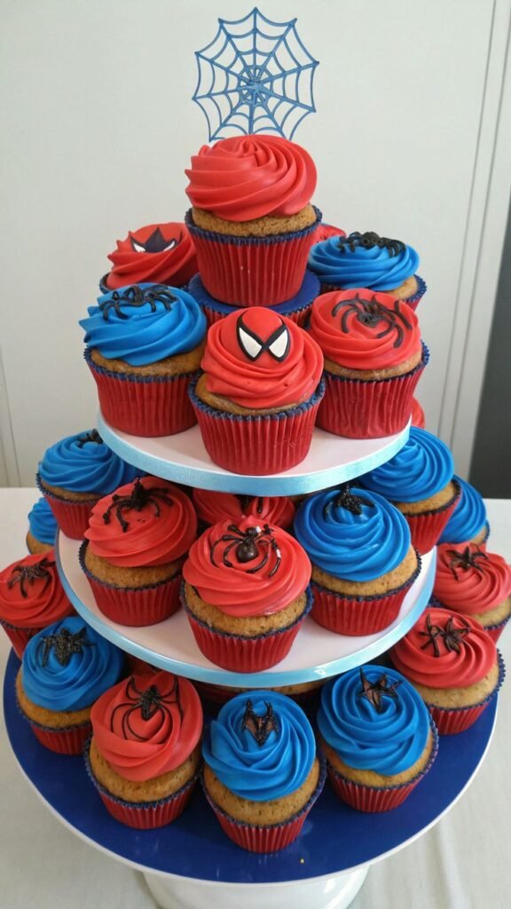 This tiered cupcake display is a sweet treat for any superhero celebration. Each cupcake is topped with vibrant red or blue frosting. They are a delightful option among spiderman birthday party ideas.